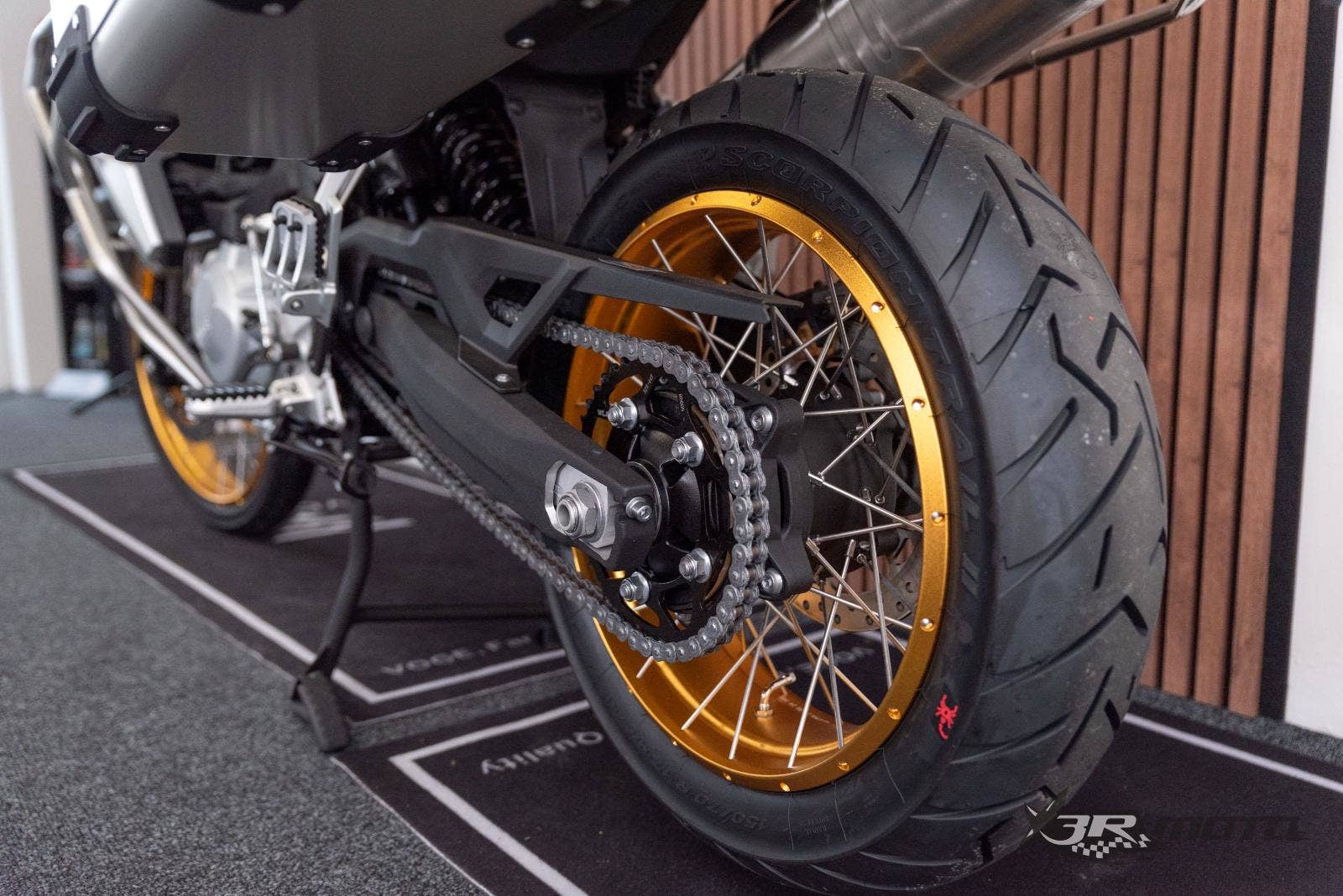 - Přední pneu90/90-R21 – bezdušové Pirelli Scorpion Trail II Zadní pneu150/70-R17 – bezdušové Pirelli Scorpion Trail II Přední brzdy2x dvoupístkové třmeny BREMBO, 2× kotouč (ø 305 mm)